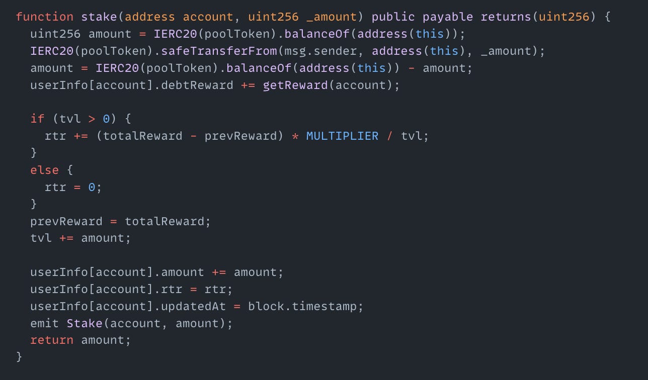 On December 20th, the JFIN exploit on the Ethereum mainnet resulted in a $15K loss. The root cause of the exploit was a reward calculation error (double counting) in the JFIN LCBridgev2Token contract’s stake() function. Before updating a user’s stake, the contract added getReward(account) to debtReward. However, getReward() already included the existing debtReward. This caused the old debt to be counted twice. By repeatedly calling stake() with 1 WEI, an attacker inflated debtReward. The attacker then called claimReward() to withdraw the inflated balance.