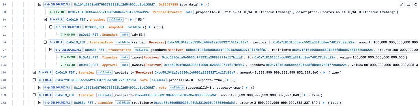 On December 14th, the FutureSwapX exploit on the Ethereum mainnet resulted in a $500K loss. The root cause of the exploit was a voting logic vulnerability that allowed flashloaned tokens to be counted as voting power. The attacker first flash loaned 3.6M FST tokens and created a proposal in the same transaction. FutureSwap’s Governance contract recorded the attacker’s inflated balance. The attacker then voted using the recorded snapshot balance. After voting, the flash loan was repaid. The proposal passed with artificial voting power, allowing the attacker to drain funds.