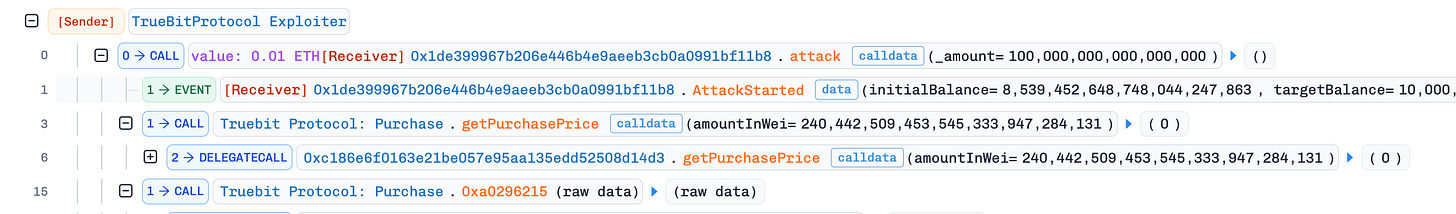 On January 8th, the Truebit exploit on the Ethereum mainnet resulted in a $26.6M loss. The root cause was an integer overflow in the getPurchasePrice() function. The function computes token price via (v12 + v9) / v6, where both v12 and v9 were values close to the uint256 maximum. Their sum overflowed back to near zero, causing the division to return 0. Since the getPurchasePrice() function returned zero, the attacker was able to mint 240 million TRU tokens at no cost.