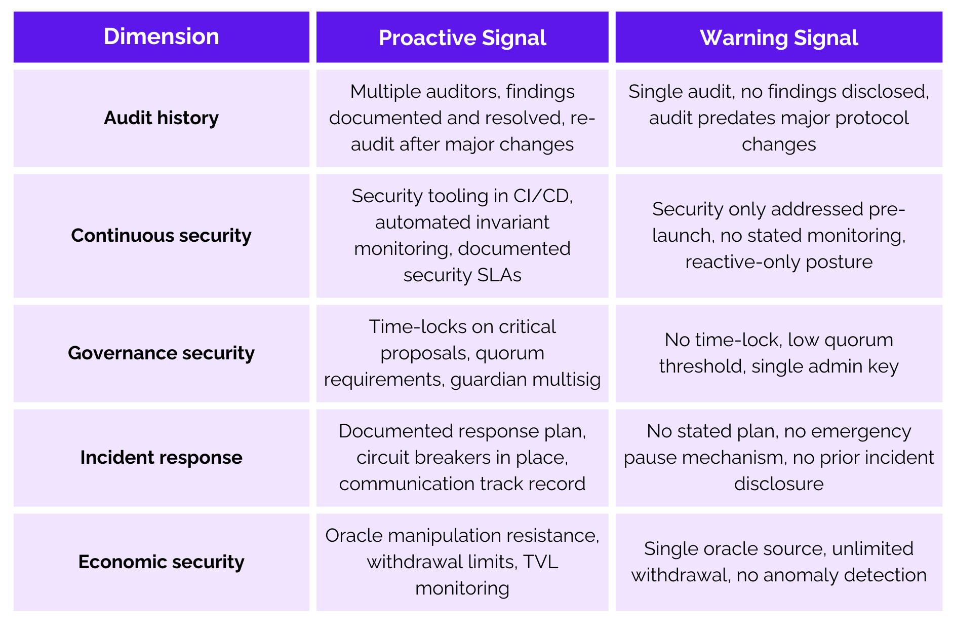 A security budget that does not scale with TVL; a $1B protocol spending $50K/year on security is not a security-first team